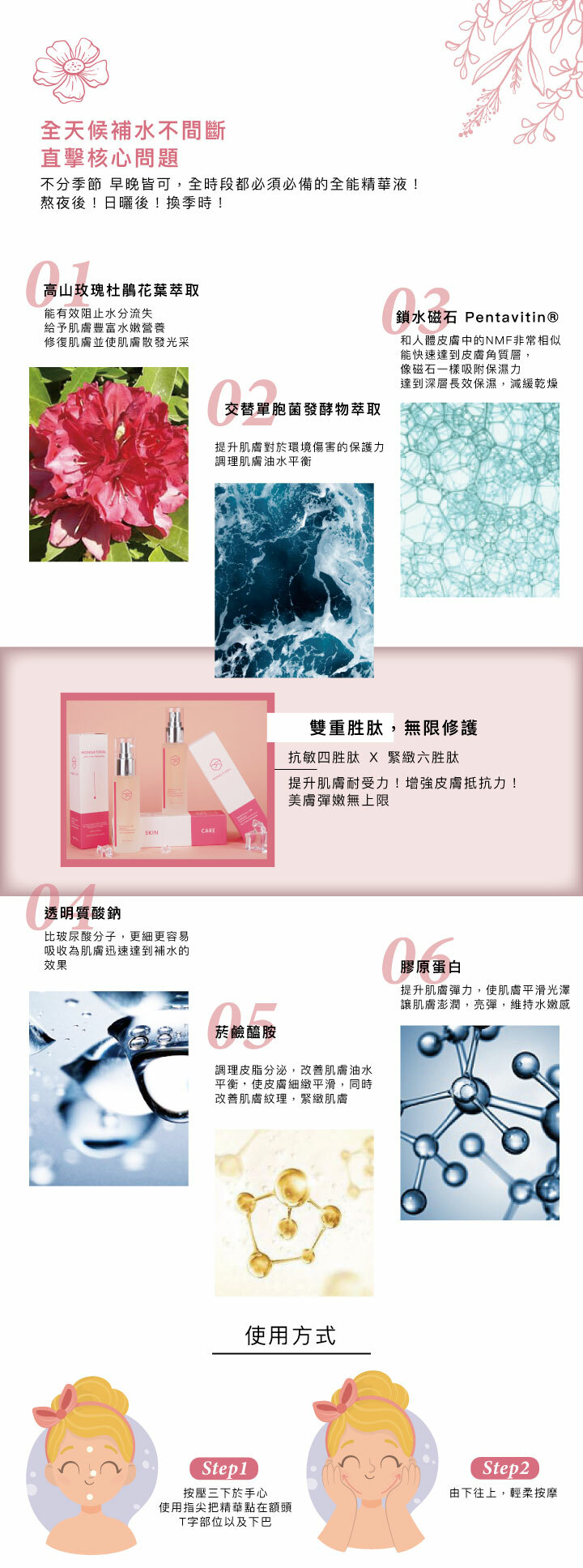 2. 四胜肽:加強緊緻效果,賦予肌膚彈性與張力,達到緊緻、減少細紋產生。